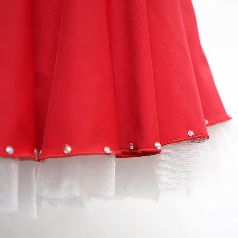 This knee-length red dress features a sweetheart neck with nude insert, and a green laced pattern. Lantern sleeves.