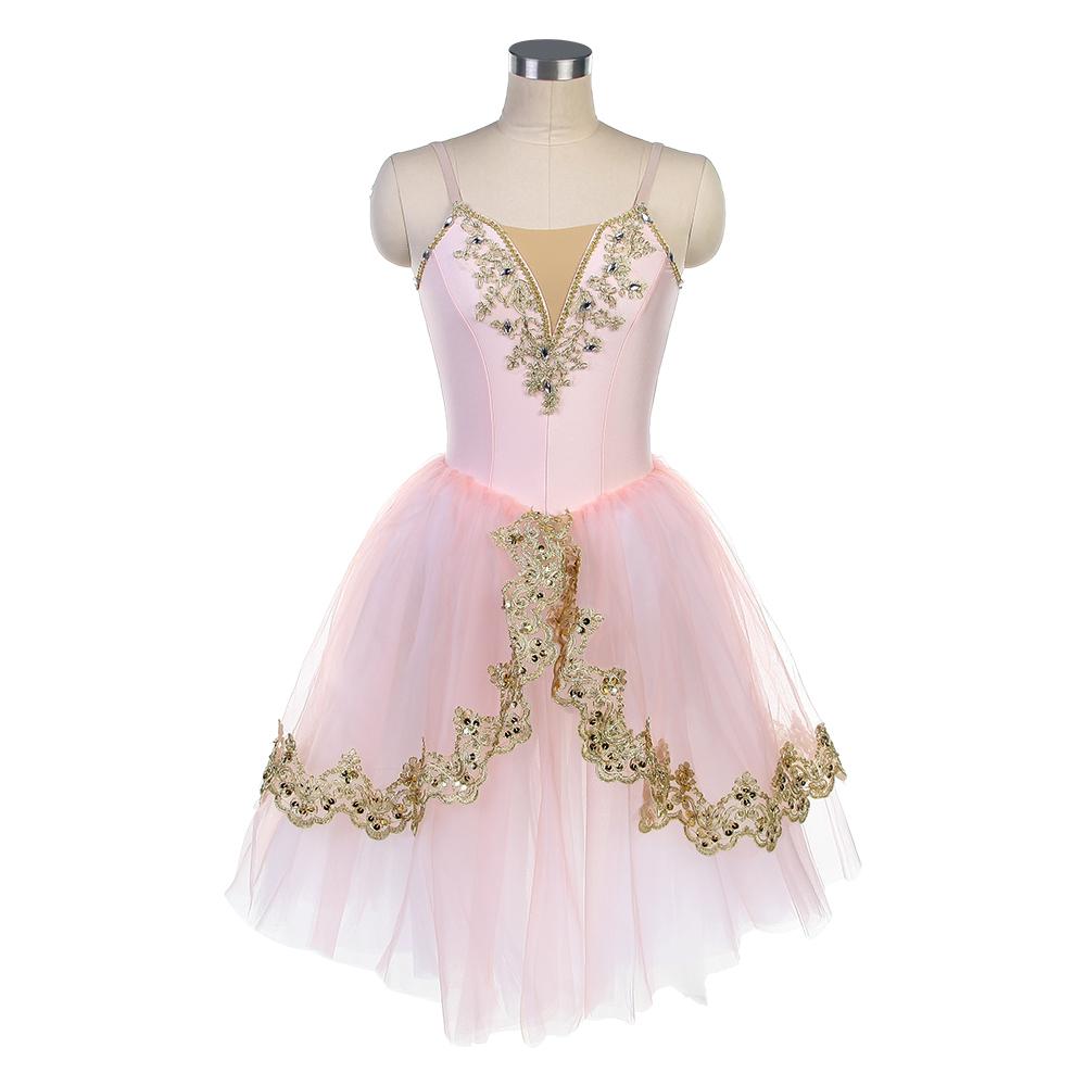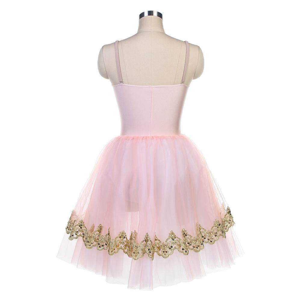 This pull-on tutu, suitable for children, teens and adults, features a lycra pale pink bodice, V neckline with nude insert, and rich gold decorations.