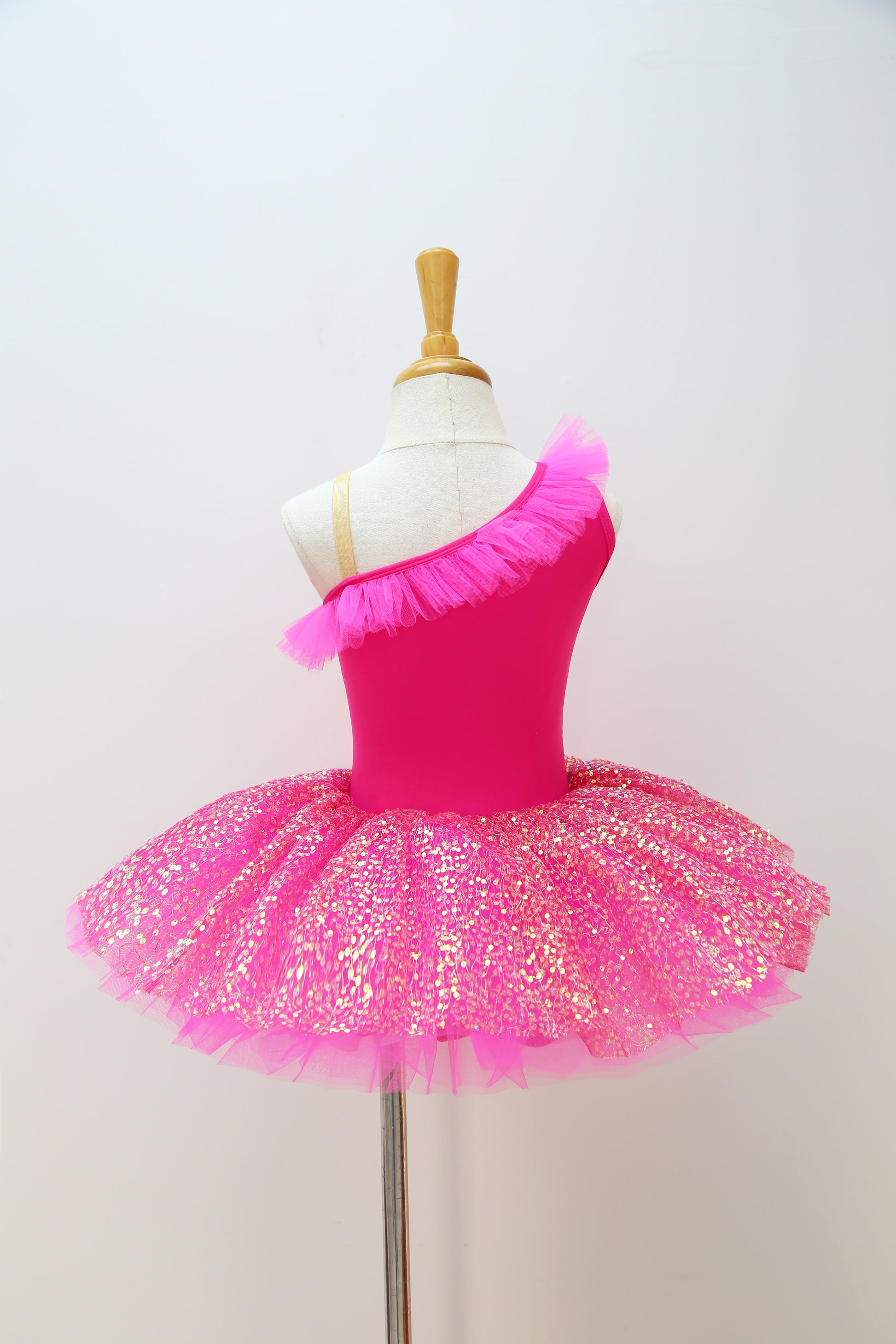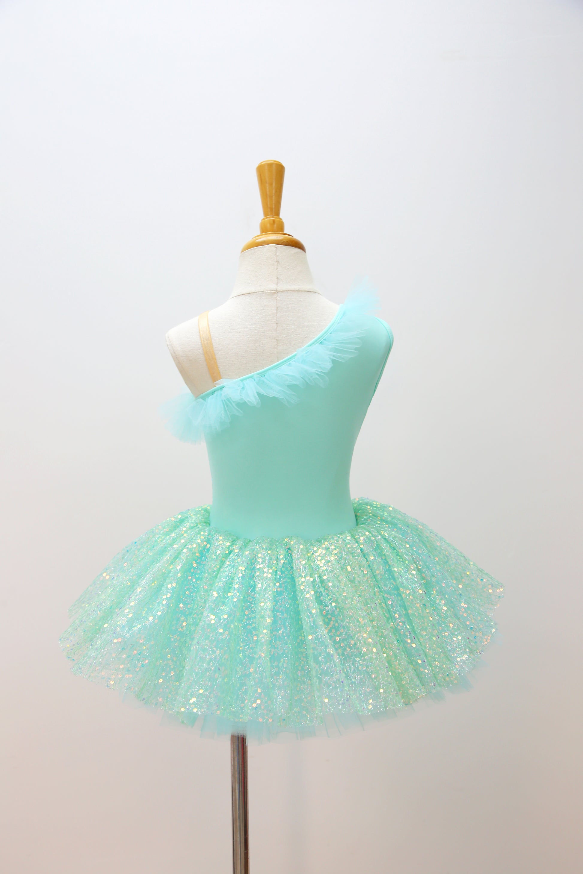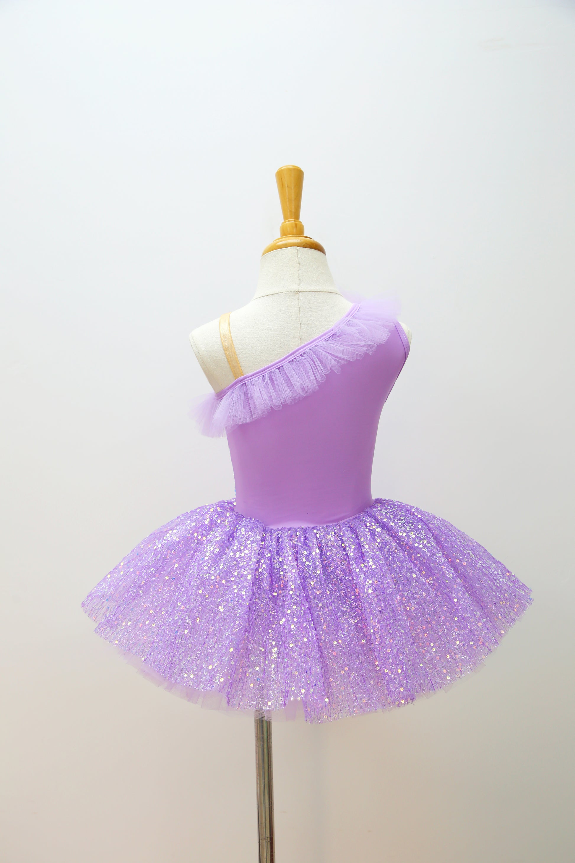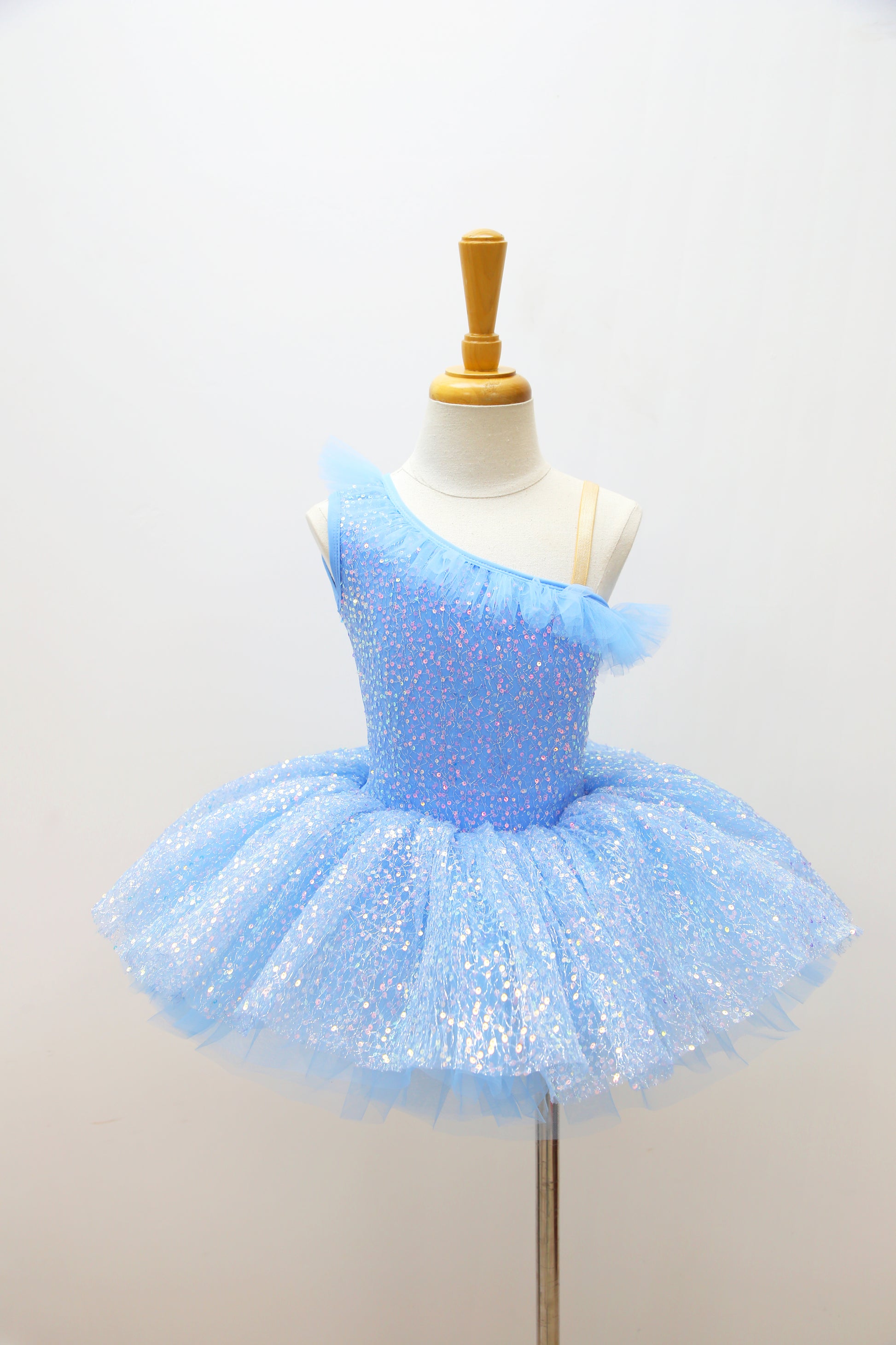 Child/teen pull-on bell-shaped tutu featuring one shoulder and nude straps. The entire front part of the bodice is made with sparkling lurex, and decorated along the diagonal neckline with tulle.